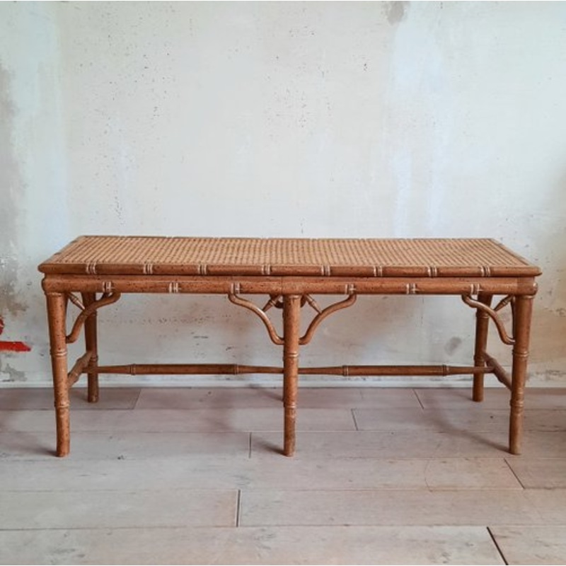 Because there was likely always a cushion on it, the rattan webbing of this bench is in good condition, as is the wooden frame. Decorative as a hallway bench, in front of a low window or at the foot of your bed.