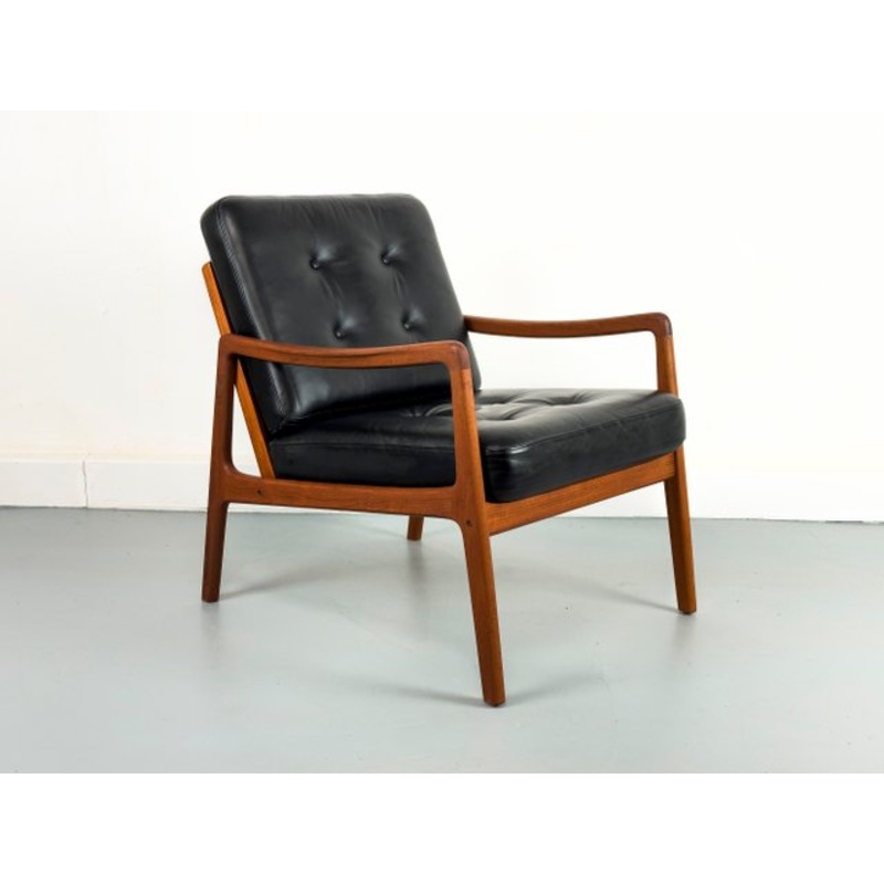 Beautifully designed and rare lounge chair (model FD 109) designed by Prof. Ole Wanscher.Filigree frame made of solid teak with loose black leather upholstery. Frame provided with plaque.Product information: Manufacturer: France&Sn Design: Prof. Ole Wansch