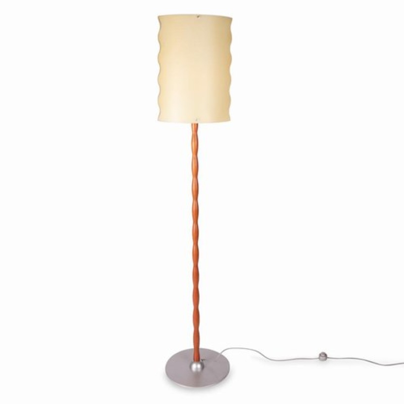 Floor lamp made by the Italian company F. Fabbian in the 1990s. The lamp stands on a metal base with a turned cherry wood leg. The lamp has a two piece glass shade. The lamp is in very good original condition.