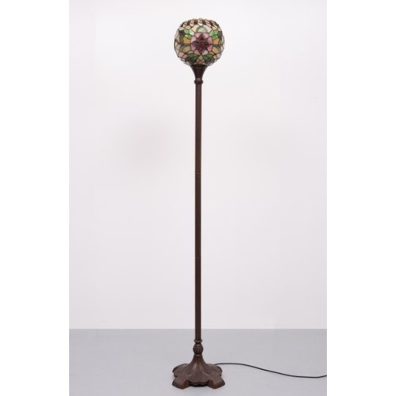Bronze color upright ,comes with a handmade stained Glass shade, Stoneware base. Beautiful colored shade ,gives a very nice effect when lid . very good condition. Tiffany & Co in style.One large E27 bulb needed. Creator Tiffany Design Period 1990 to 1999 Y
