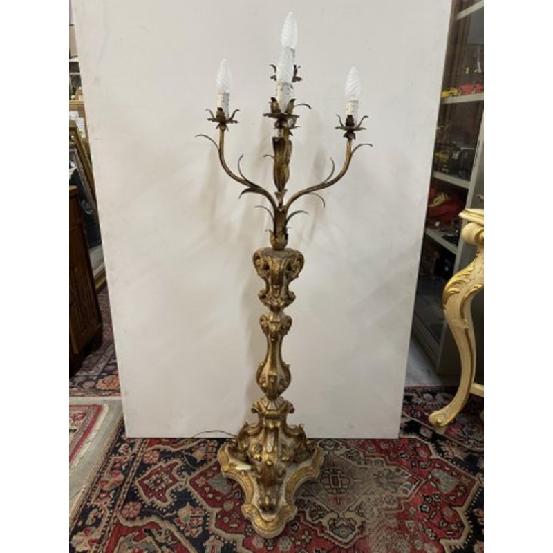 Floor lamp/candle holder from the early 1900s, in cream lacquered wood and gold leaf. It rests on a rectangular base with three curled feet, the upper part is in gilded iron with leaves. The electrical system is in perfect working order, the structure is healthy and solid.