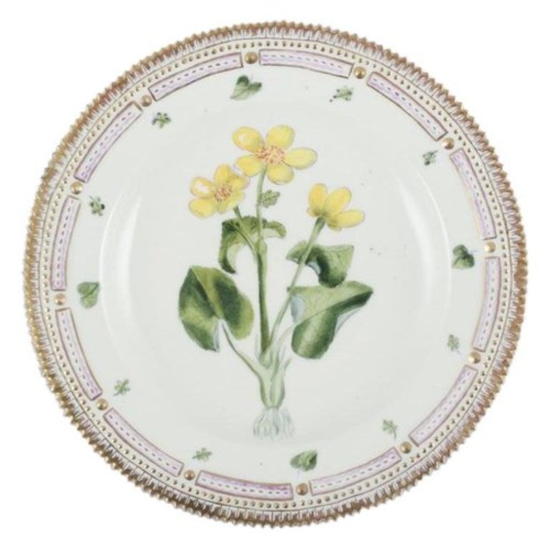 Royal Copenhagen Flora Danica Dinner plate in hand-painted porcelain with flowers and gold decoration. Painted outside the factory. Dating: 1921 Latin name. In excellent condition. Third factory quality. Marked. Diameter: 25,5 cm.