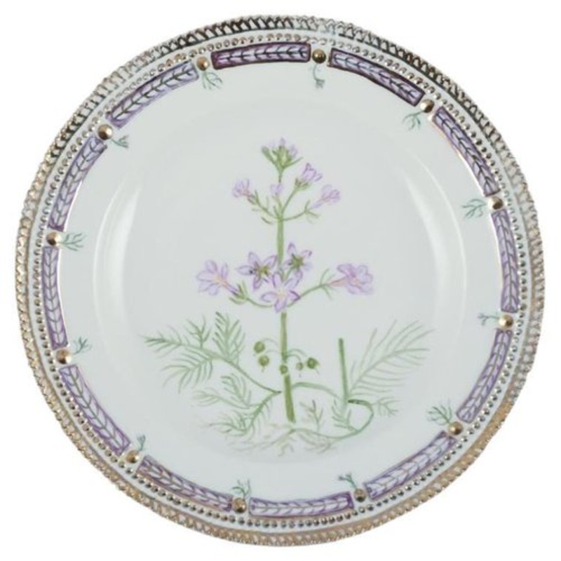 Royal Copenhagen Flora Danica Dinner plate in hand-painted porcelain with flowers and gold decoration. Painted outside the factory. Dating: Approx. 1930/40s Latin and Danish names. In excellent condition. Second factory quality. Marked. Diameter: 25,5 cm.