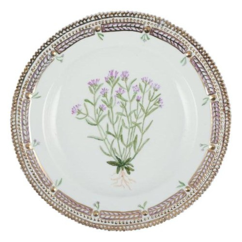 Royal Copenhagen Flora Danica Dinner plate in hand-painted porcelain with flowers and gold decoration. Painted outside the factory. Dating: 1950 Latin and Danish names. In excellent condition. Second factory quality. Marked. Diameter: 25,5 cm. Design Perio