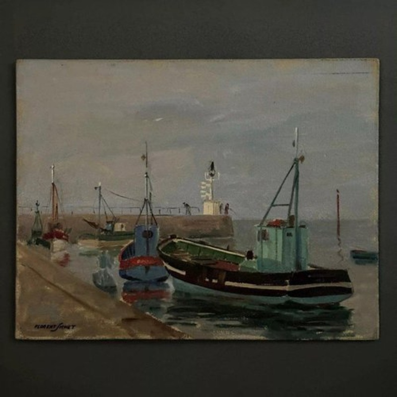 "Oil On Cardboard 20th Century By Florent Sichet Trawlers Fishing Boats" This oil painting depicting fishing boats is signed by Florent Sichet (1918-2014) a painter from Noirmoutier, this artist is known for his work depicting nature and daily life on the