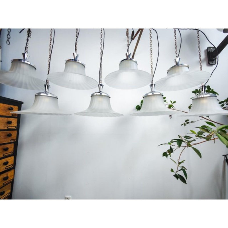 : Set of 8 fluted etched glass pendants by Dutch company RAAK. These pendants have their original glass, however we fitted them with not original but period chrome plated brass galleries. Manufacturer Raak Amsterdam Design Period 1950 to 1959 Production Pe