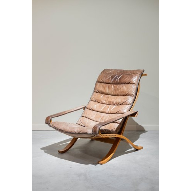 Folding and very comfortable single-seat armchair with arms from the 60s designed by Ingmar Relling. Original leather cushions and wooden structure in good condition. Keep the original label. Creator Ingmar Relling Manufacturer Westnofa Design Period 1960