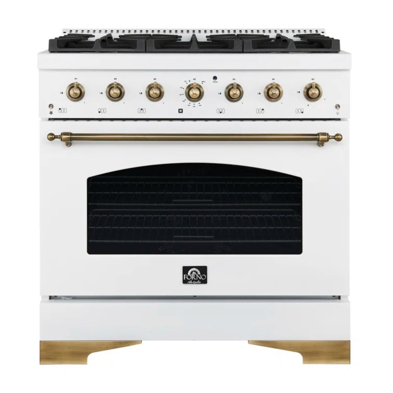 The Forno Espresso Antico 36″ Gas Range in white offers 6 sealed burners with a total 71,000 BTU output, dual-ring brass burner for precise control, and a 4.5 cu.ft. convection oven for even baking and roasting. With a sleek white finish and antique brass accents, this range adds timeless elegance to any kitchen. Backed by a 2-year warranty, it’s designed to inspire culinary creativity.