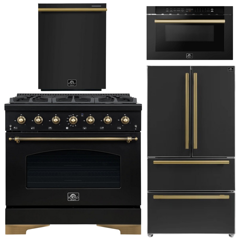 OO621835296449FORNO Antico Package – 36″ Gas Range, 36″ Refrigerator with Ice Maker, Dishwasher and 24″ Microwave Drawer in Black with Antique Brass Accents