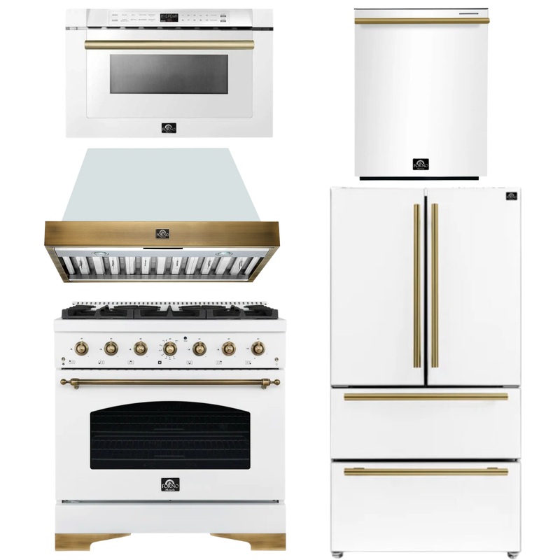 OO621835296461FORNO Antico Package – 36″ Gas Range, Range Hood, 36″ Refrigerator with Ice Maker, Dishwasher and 24″ Microwave Drawer in White with Antique Brass Accents