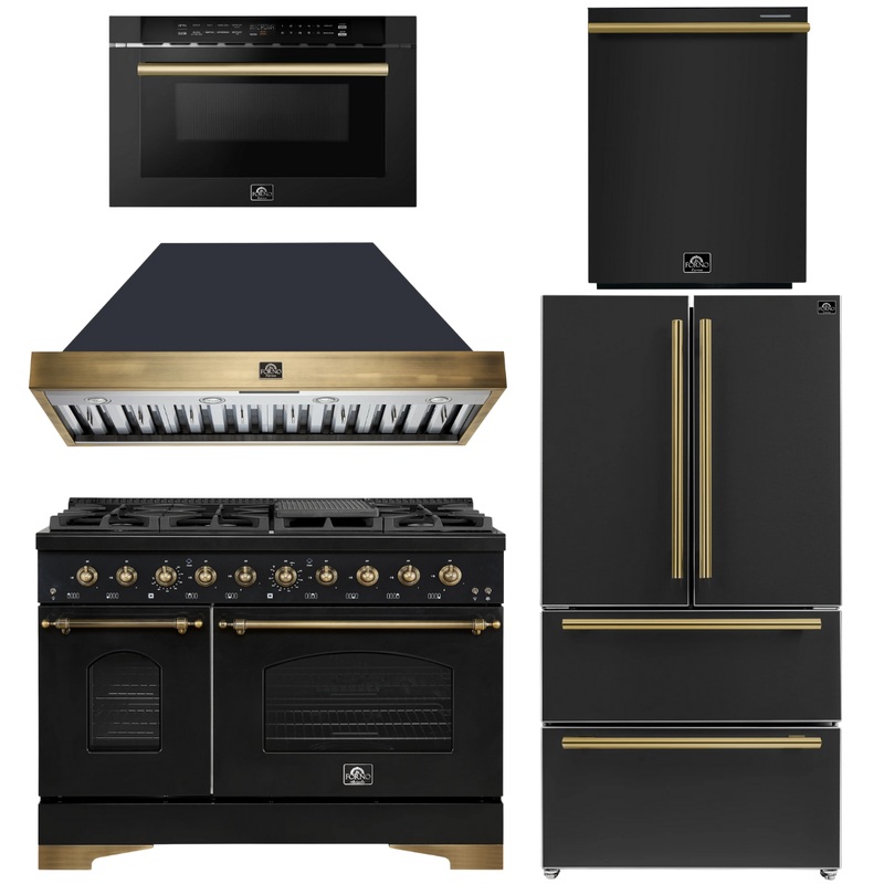 OO621835296462FORNO Antico Package – 48″ Dual Fuel Range, Range Hood, 36″ Refrigerator with Ice Maker, Dishwasher and 24″ Microwave Drawer in Black with Antique Brass Accents