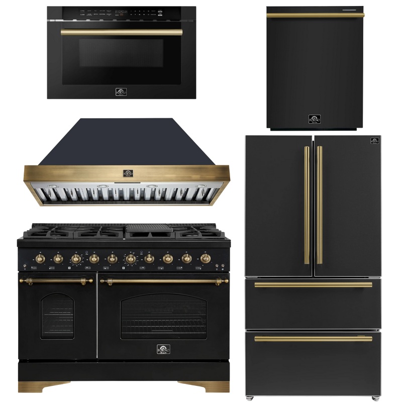 FORNO Antico Package – 48″ Gas Range, Range Hood, 36″ Refrigerator with Ice Maker, Dishwasher and 24″ Microwave Drawer in Black with Antique Brass Accents