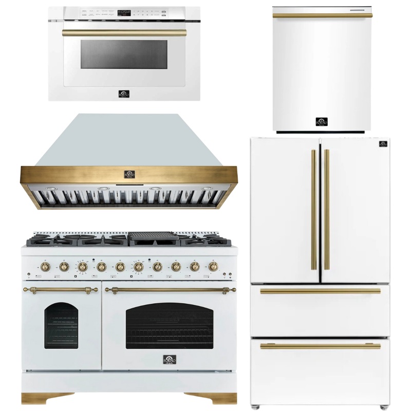 FORNO Antico Package – 48″ Gas Range, Range Hood, 36″ Refrigerator with Ice Maker, Dishwasher and 24″ Microwave Drawer in White with Antique Brass Accents