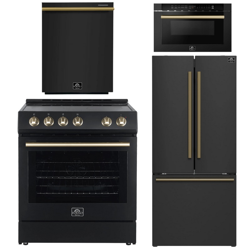 FORNO Espresso Package – 30″ Electric Range, 30″ Refrigerator with Ice Maker, Dishwasher and 24″ Microwave Drawer in Black with Antique Brass Accents