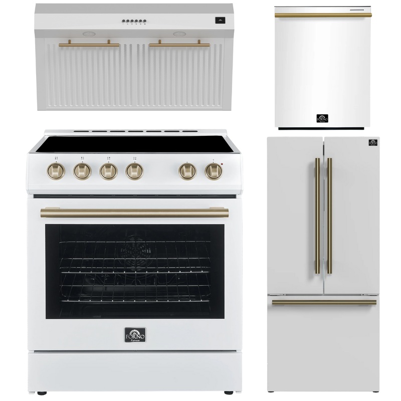 FORNO Espresso Package – 30″ Electric Range, Range Hood, 30″ Refrigerator with Ice Maker and Dishwasher in White with Antique Brass Accents