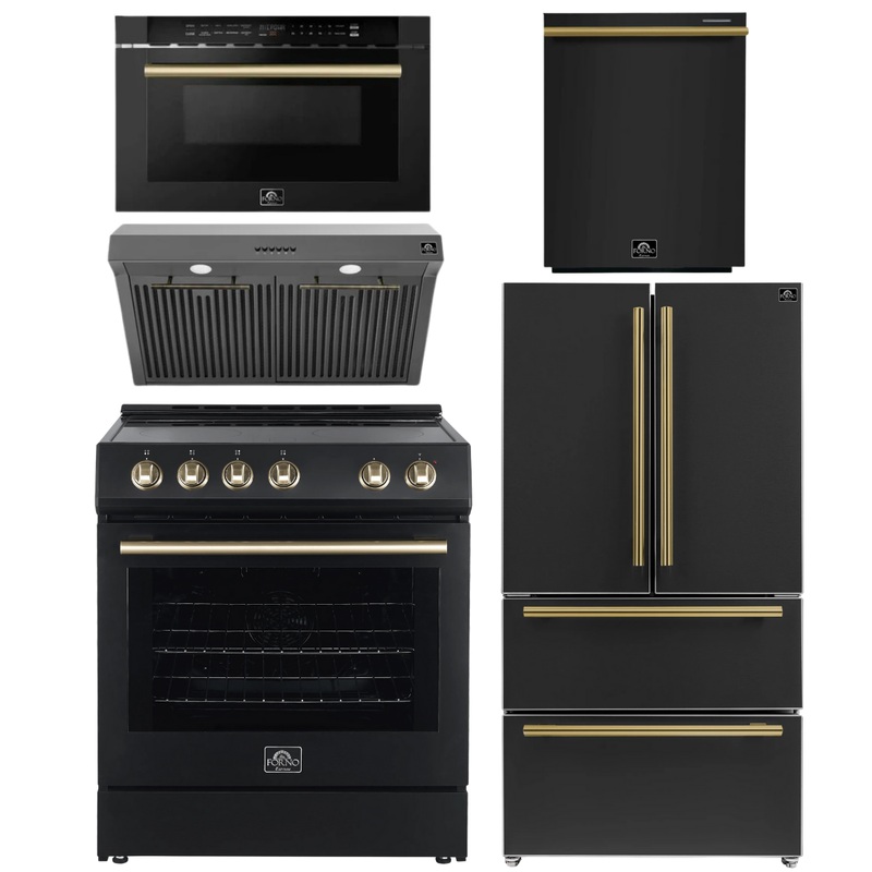 FORNO Espresso Package – 30″ Electric Range, Range Hood, 36″ Refrigerator with Ice Maker, Dishwasher and 24″ Microwave Drawer in Black with Antique Brass Accents