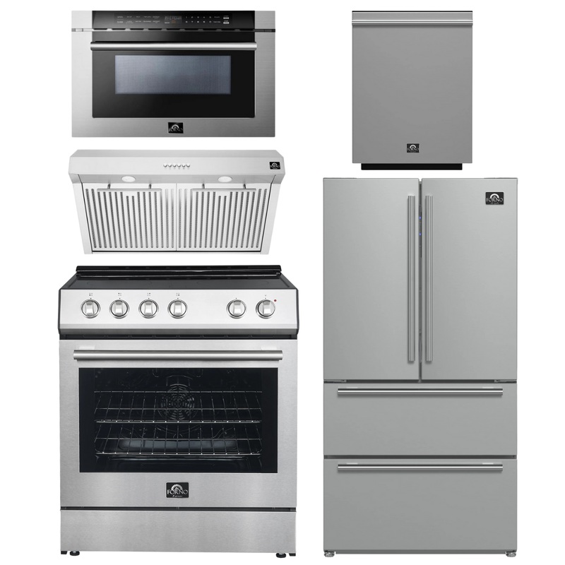 FORNO Espresso Package – 30″ Electric Range, Range Hood, 36″ Refrigerator with Ice Maker, Dishwasher and 24″ Microwave Drawer in Stainless Steel