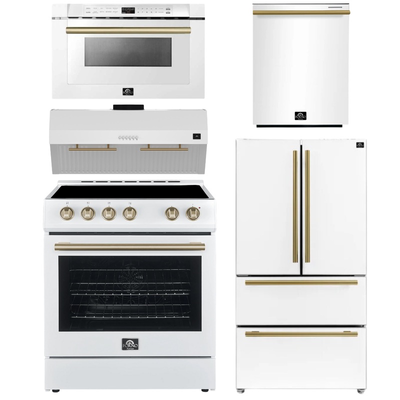 OO621835297567FORNO Espresso Package – 30″ Electric Range, Range Hood, 36″ Refrigerator with Ice Maker, Dishwasher and 24″ Microwave Drawer in White with Antique Brass Accents