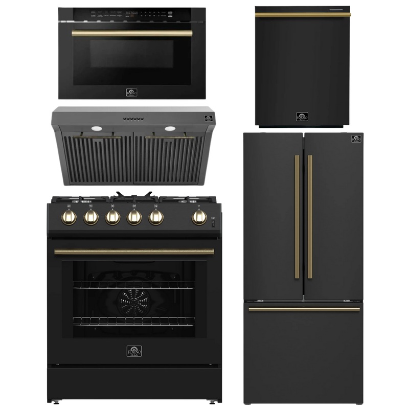 OO621835297562FORNO Espresso Package - 30" Gas Range, Range Hood, 30" Refrigerator with Ice Maker, Dishwasher and 24" Microwave Drawer in Black with Antique Brass Accents
