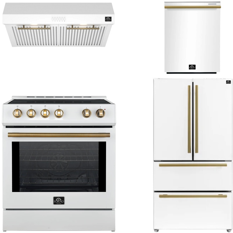 This Forno Espresso Appliance Package is complete with a 30" Electric Range, 30" Range Hood, 31" Refrigerator and 24" Dishwasher.What's IncludedFORNO Espresso Leonardo 30" 5 cu. ft. Induction Range with Knob Control in White and Antique Brass Accents, FFSI