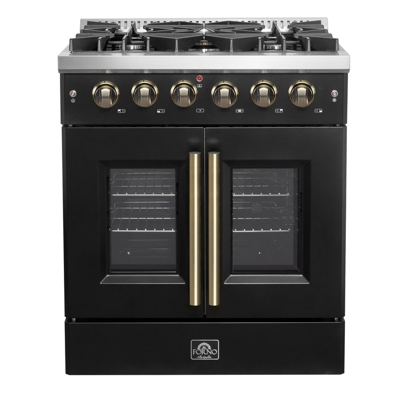 The Forno Galiano 30" French Door Gas Range in black brings professional styling and performance into your home kitchen at an affordable price. Enjoy effortless access to your oven with French doors that offer an extra 12 inches of space. The cooking surfa