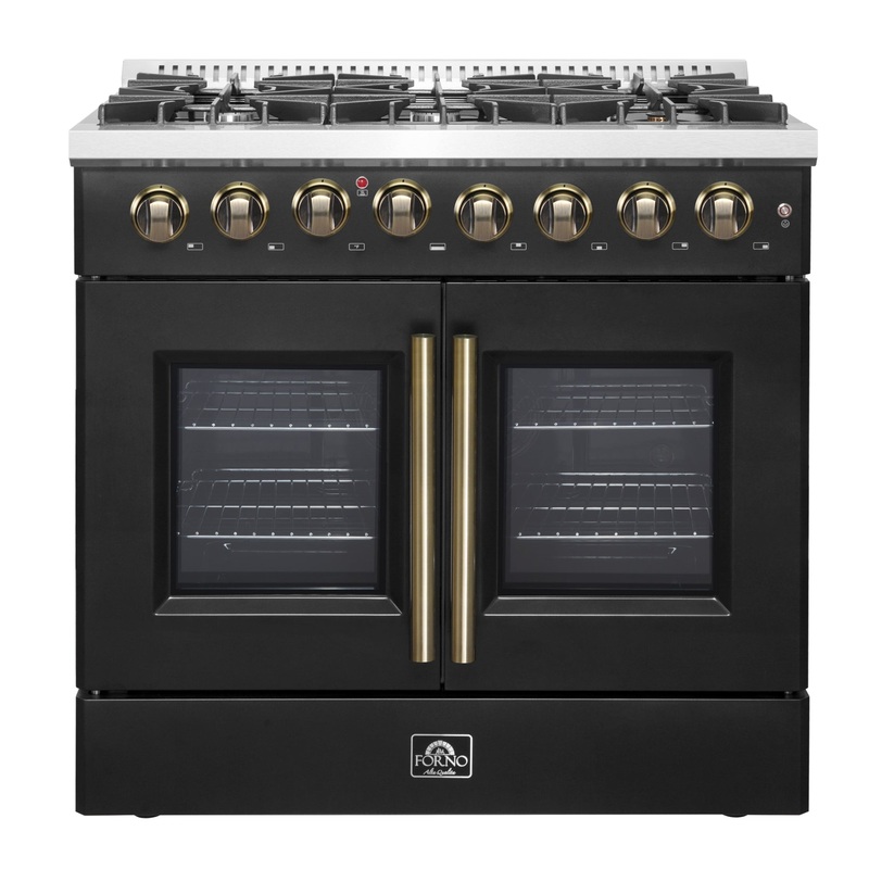 Our 36" Galiano Dual Fuel French Door Range blends timeless design and high performance. Featuring a sleek black finish and antique brass knobs, this range adds sophistication to any kitchen at an affordable price. The cooktop boasts six sealed burners wit