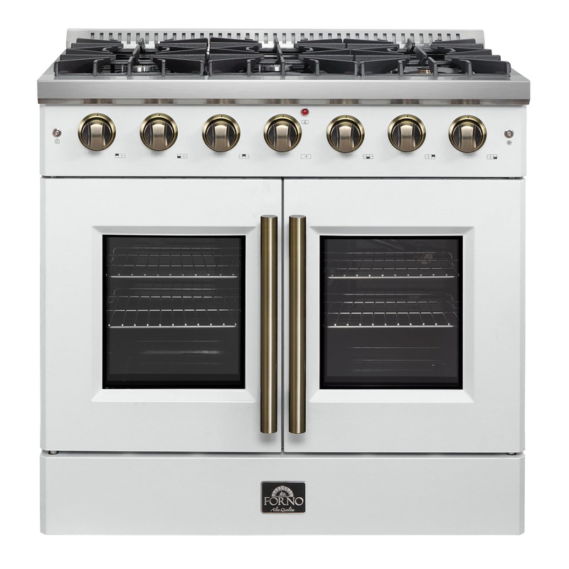 The Forno Galiano 36" French Door Gas Range in white brings professional styling and performance into your home kitchen at an affordable price. Enjoy effortless access to your oven with French doors that offer an extra 12 inches of space. The cooking surfa