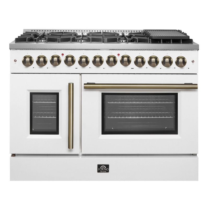 Our 48" Galiano Dual Fuel French Door Range blends timeless design and high performance. Featuring a crisp white finish and antique brass knobs, this range adds sophistication to any kitchen at an affordable price. The cooktop boasts eight sealed burners w