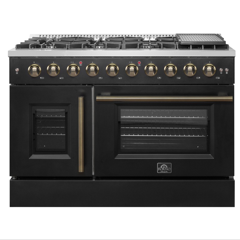 The Forno Galiano 48" French Door Gas Range in black brings professional styling and performance into your home kitchen at an affordable price. Enjoy effortless access to your oven with French doors that offer an extra 12 inches of space. The cooking surfa