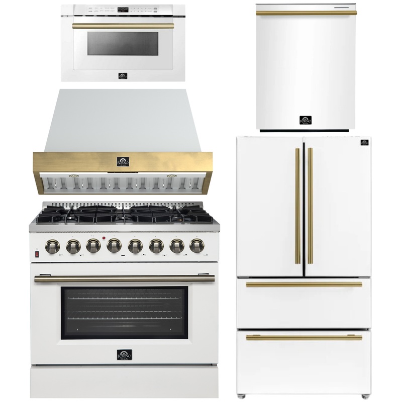 OO621835297309FORNO Galiano Package - 36" Dual Fuel Range, Range Hood, 36" Refrigerator with Ice Maker, Dishwasher and 24" Microwave Drawer in White with Antique Brass Accents