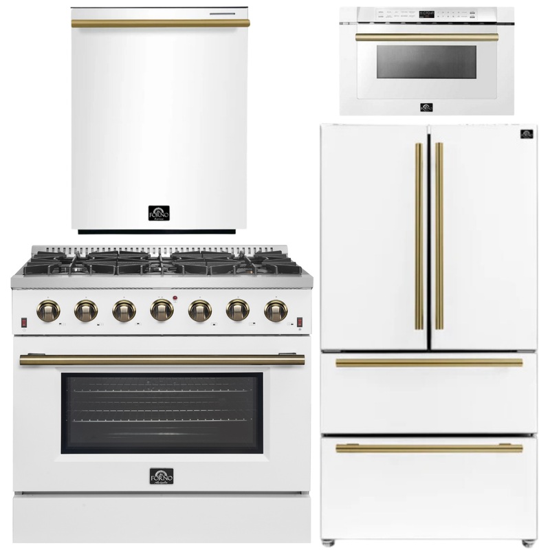 OO621835297286FORNO Galiano Package – 36″ Gas Range, 36″ Refrigerator with Ice Maker, Dishwasher and 24″ Microwave Drawer in White with Antique Brass Accents