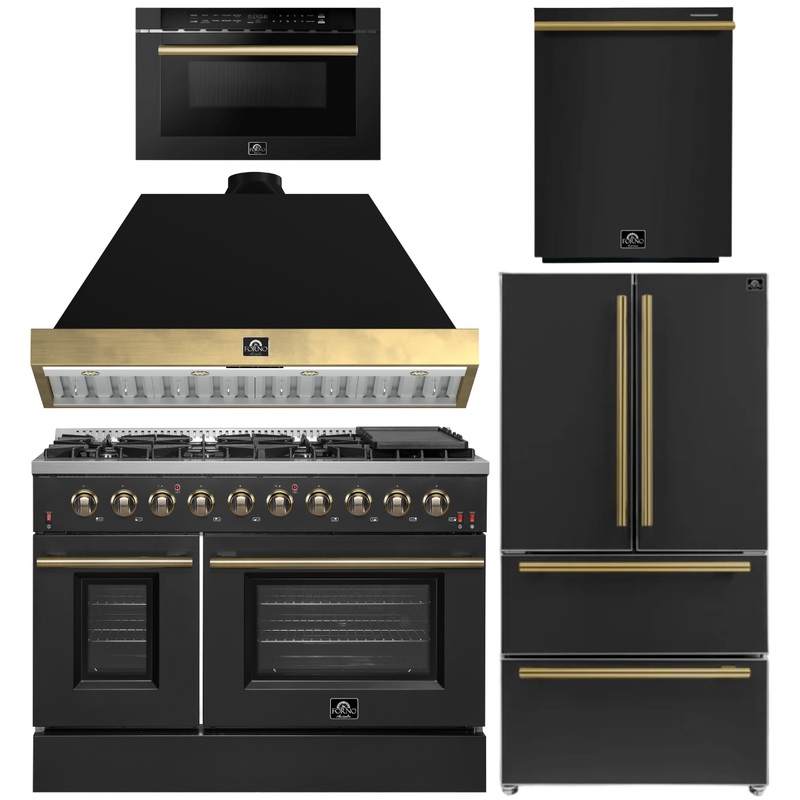 OO621835297302FORNO Galiano Package – 48″ Gas Range, Range Hood, 36″ Refrigerator with Ice Maker, Dishwasher and 24″ Microwave Drawer in Black with Antique Brass Accents