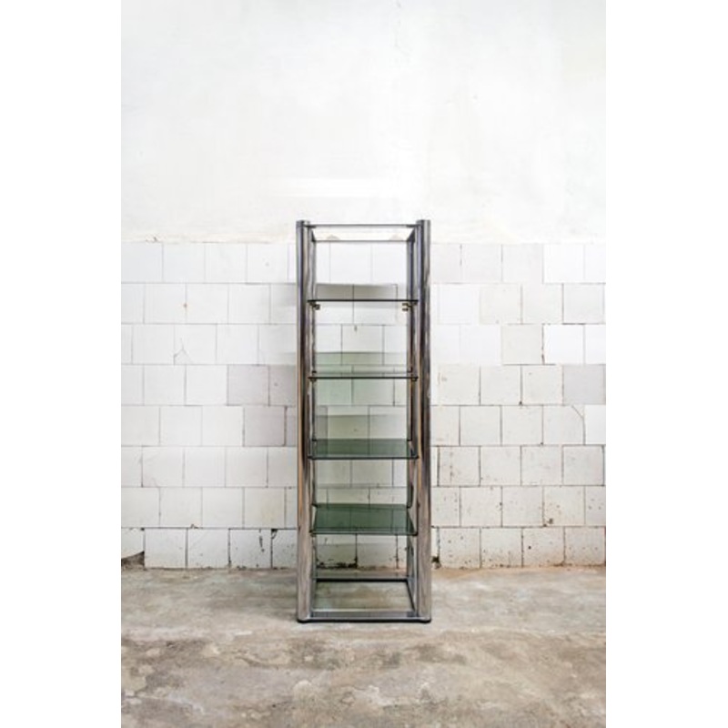 Self-supporting bookcase with chromed steel structure and smoked glass shelves. Italian production70s Design Period 1970 to 1979 Production Period 1970 to 1979 Country of Manufacture Italy Style Italian, Vintage, Space Age Detailed Condition Very Good This