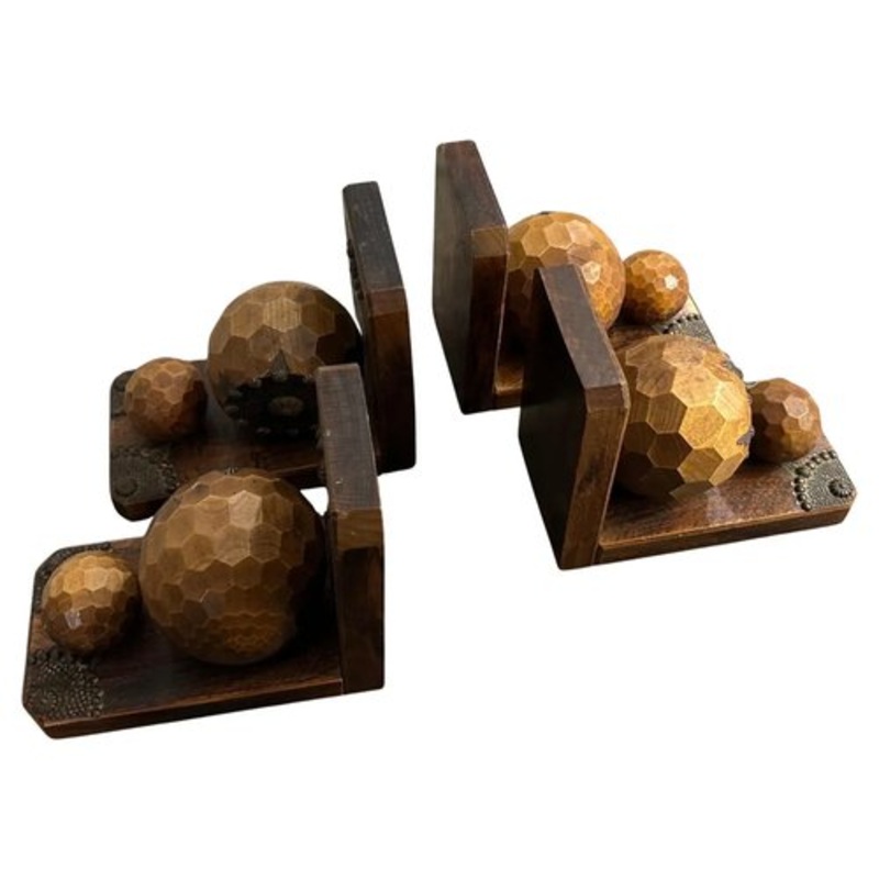 This is a striking set of four bookends that captures the essence of the Art Deco era. They blend contrasting materials, warm-toned wood with the darker, more rigid iron in a design that’s both geometric and subtly whimsical. Their French origin is a testament to the period’s focus on elegance and craftsmanship. The wood exhibits a warm, medium-brown tone with a noticeable natural grain pattern that adds to its visual interest. Contrasting with the wood are iron elements. These are used for the spherical embellishments. The most prominent feature is the series of progressively sized, spherical wooden balls attached to the side of each bookend. These balls are the focal point, adding a three-dimensional quality to the design. The spherical motif is repeated in the iron embellishments on the base, creating a visual echo. The bookends are in good vintage condition. The wood shows a rich patina, indicating age, the iron elements are well-preserved. This set of four 1930s Art Deco Wood and Iron French Bookends is a testament to the enduring appeal of the Art Deco style. They are not only functional objects but also beautiful examples of design from this period, embodying its elegance, sophistication, and appreciation for fine craftsmanship. They would make a wonderful addition to any bookshelf or collection of Art Deco objects.