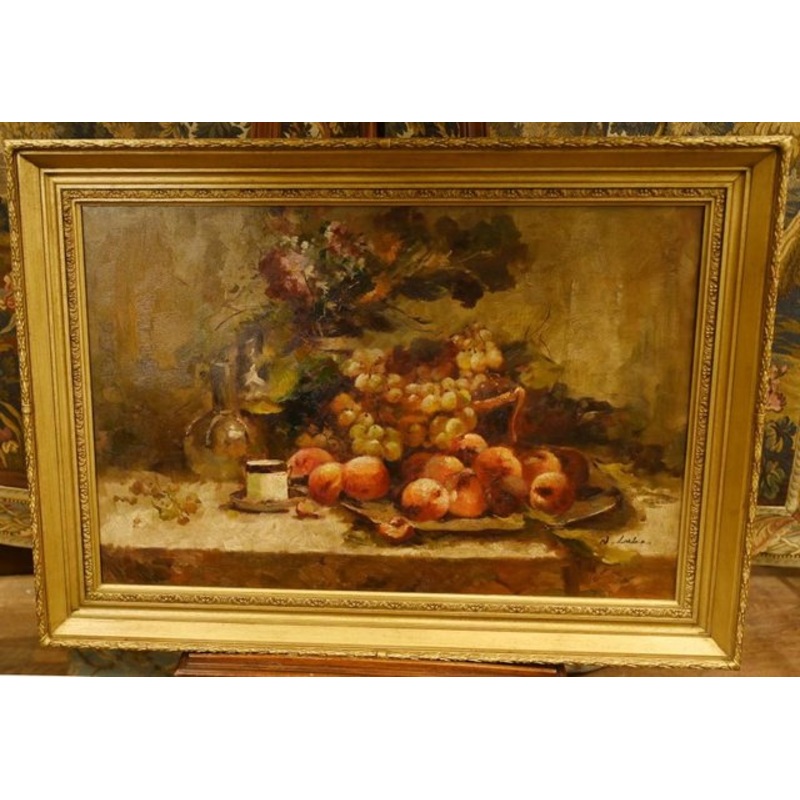 Gorgeous large French oil painting of a colourful still life Signed N. Lules in the bottom right corner please see close up photo Good size at almost four feet across Love the style of the painting which with the broad brushstrokes and style is impressionistic Fruits in the foreground, a cup of coffee and the floral spray in the background Very evocative piece and would lighten up any room Comes in the gilt frame ready to hang. Offered in great shape ready for home use right away – there is a slight crack in the bottom which is not visible on the outside Dimensions in inches (CM): Width x Height 43 (109) x 31 (87)