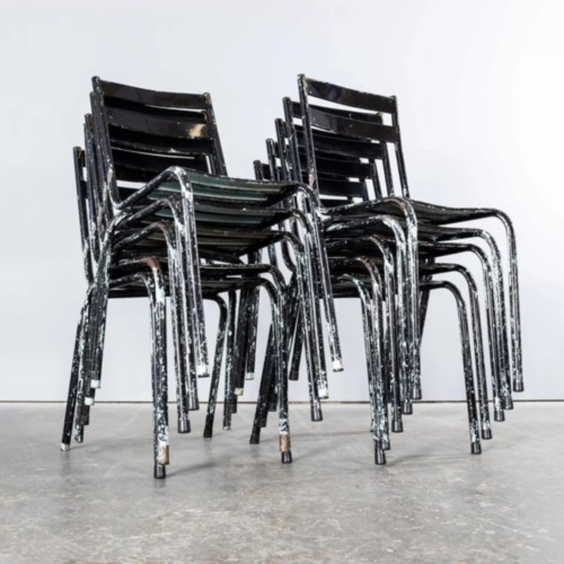 : 1950’s French ArtProg Sky Black Metal Stacking Outdoor Chairs -Various Quantities Available. Reminiscent of Tolix but not made by Tolix, ArtProg was a producer in Gray in Haute Saone. Sometimes known as the ‘Toledo’ chair it was industrially produced in the 1950’s.The chair was renowned as a marketing tool for the major brewers often stamped with the brewers name and given to the pubs/bars at substantial discount to help promote their beer. Good practical stacking outdoor chairs restored by our workshop and in good strong condition. This batch was originally a sky blue but has been overpainted in black at some stage. Seat Height 45cm. Date:1950’s Dimensions:80cm(w) x 48cm(l) x 48cm(h)
