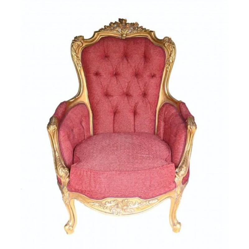 Hand carved frame finished in gilt for that gold effect Just reupholstered so free from previous owners smells such as pets and smoke