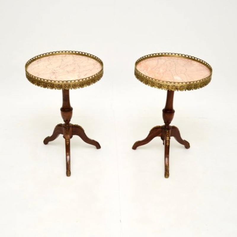 The quality is outstanding and they are a very useful size. The marble tops have gorgeous colours and patterns, they are held in place by high quality gilt metal pierced galleries. The solid tripod legs are beautifully crafted and also have high quality gilt metal mounts.