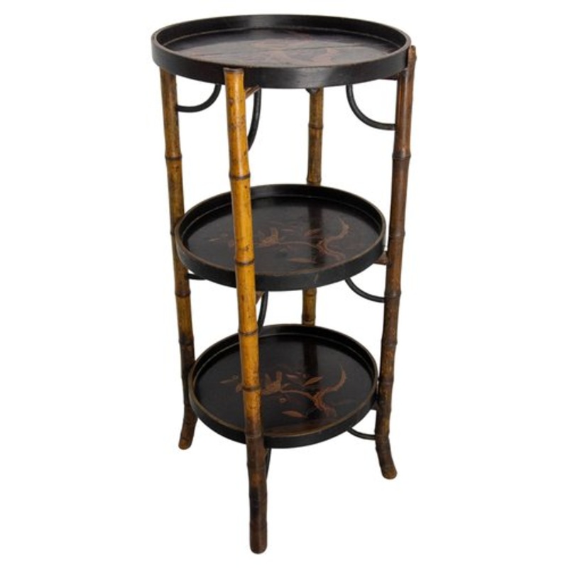 This side table or sellette was made in the late 19th century. This chinese style sellette is typical of the Napolon III priod. The entire frame is made of bamboo. Each tray is lacquered and depicts a bird on a branch. The top tray has been split and reglued. Good antique conditionwith marks of use (please see photos).