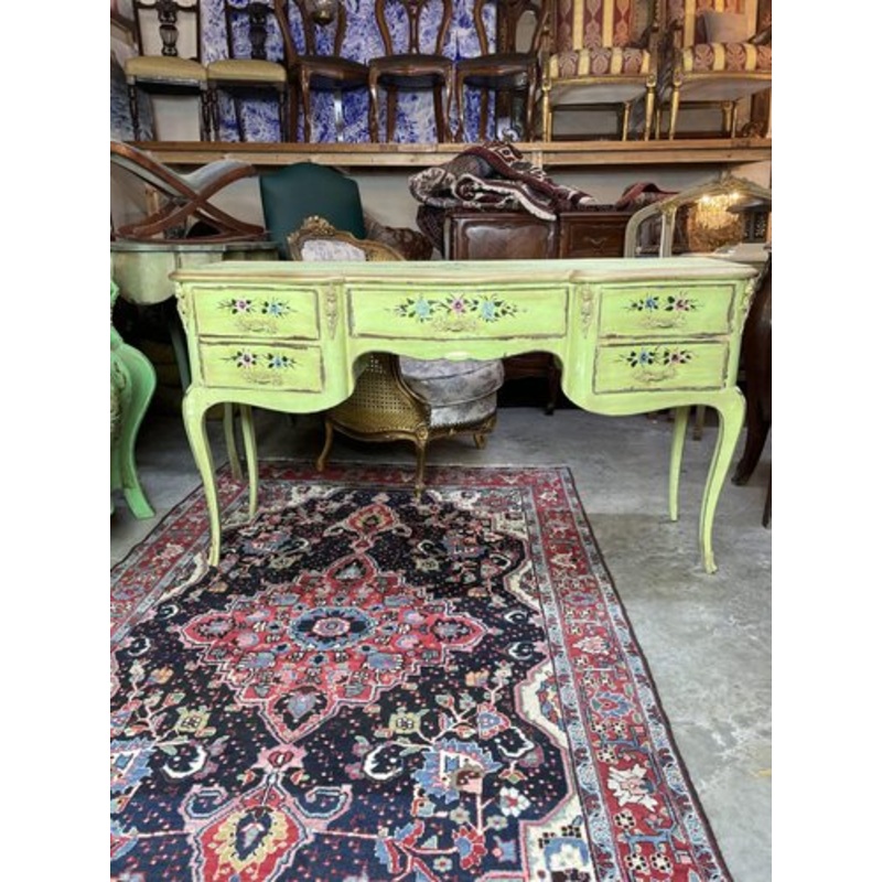 Elegant Painted Dressing Table A beautifully designed dressing table, expertly painted and distressed for a charming vintage look. Featuring a lovely shape, it stands gracefully on cabriole legs and is adorned with bronze and floral detailing. Dimensions: 140 cm (W) x 40 cm (D) x 70 cm (H)
