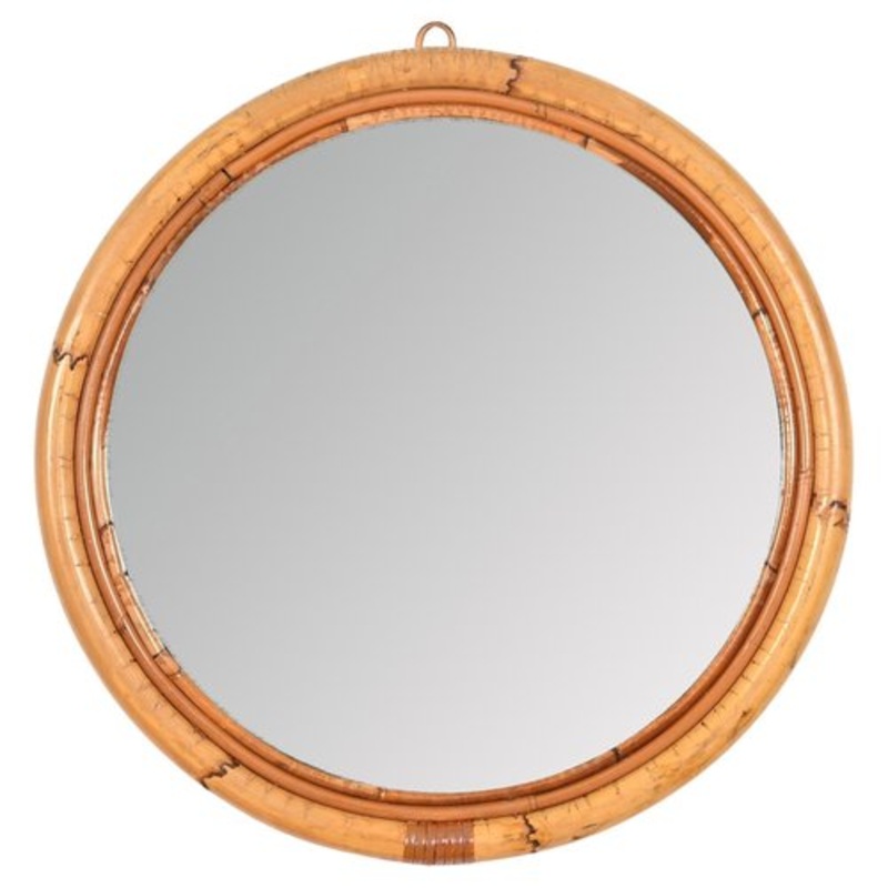 Beautiful Mid-Century round mirror with a triple frame in curved bamboo canes and woven wicker. This delightful French Riviera style mirror was produced in Italy during the 1970s. In amazing condition and with a beautiful color. The mirror has a triple round frame, the larger external one in curved bamboo and two internal one in curved rattan. The mirror is completed on the bottom by a wicker work and on the back by a protective wood panel. Fully hand-crafted with perfect proportions, this mirror is a great example of mid-century Italian organic design. A perfect mirror for an organic modern or a French Riviera style project. Dimensions (cm): Diameter – 49 Depth – 3