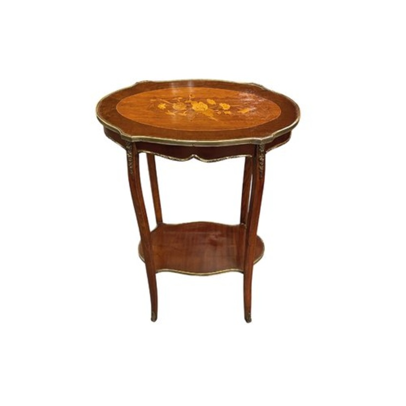 Its beech wood structure is finely covered by mahogany veneers on the sides and marquetry on the cherry, lemongrass and boxwood top. It is worth highlighting the complexity of the marquetry drawing based on floral motifs inserted in a large oval medallion.