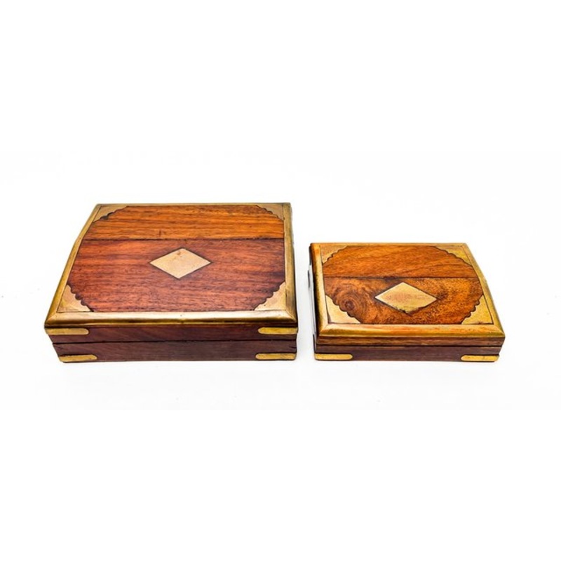 A set of two French Walnut wood boxeswhich authentically belong together.Presumably it is a cigar box with matching cigarette box.The small box fits into the larger one.They are made of Mahogany wood and have brass details.Very finely made, with small hing