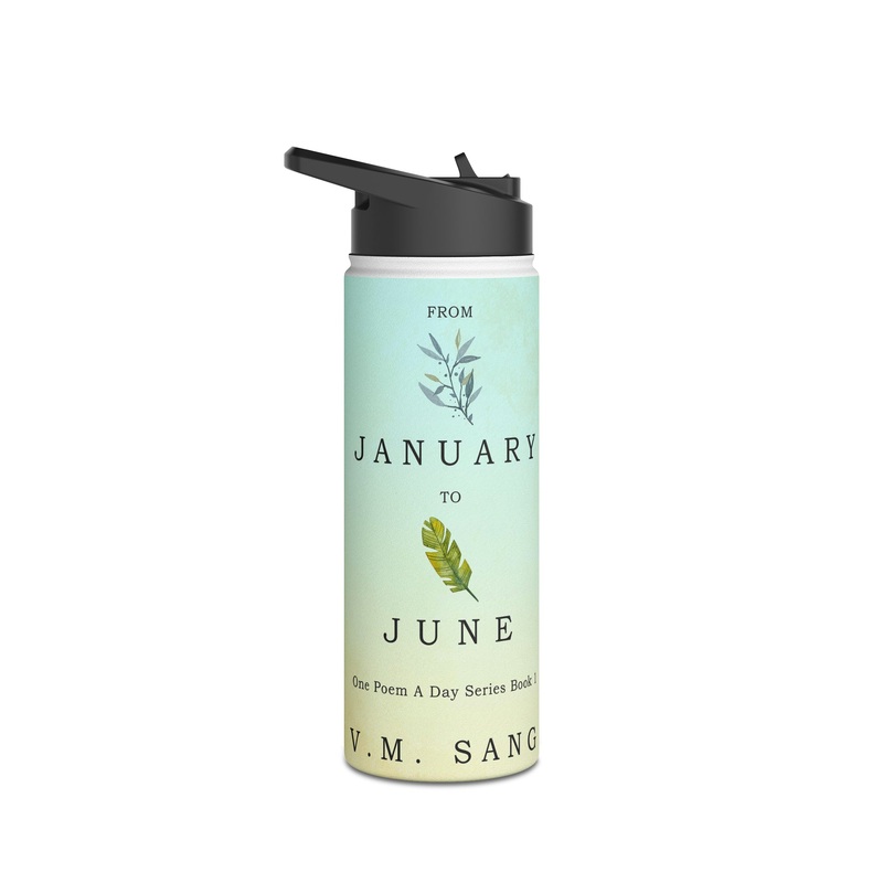 Quench your thirst in style with this 18oz stainless steel water bottle featuring a double-wall stainless steel build that keeps your drinks frosty for 24h and soothingly hot for 12h. This BPA-free, steel water bottle comes with a twist-on lid for easy sipping, making it excellent for daily use at work, at college, in the car, and beyond. The cover art in this water bottle is from V.M. Sang’s book, From January to June.