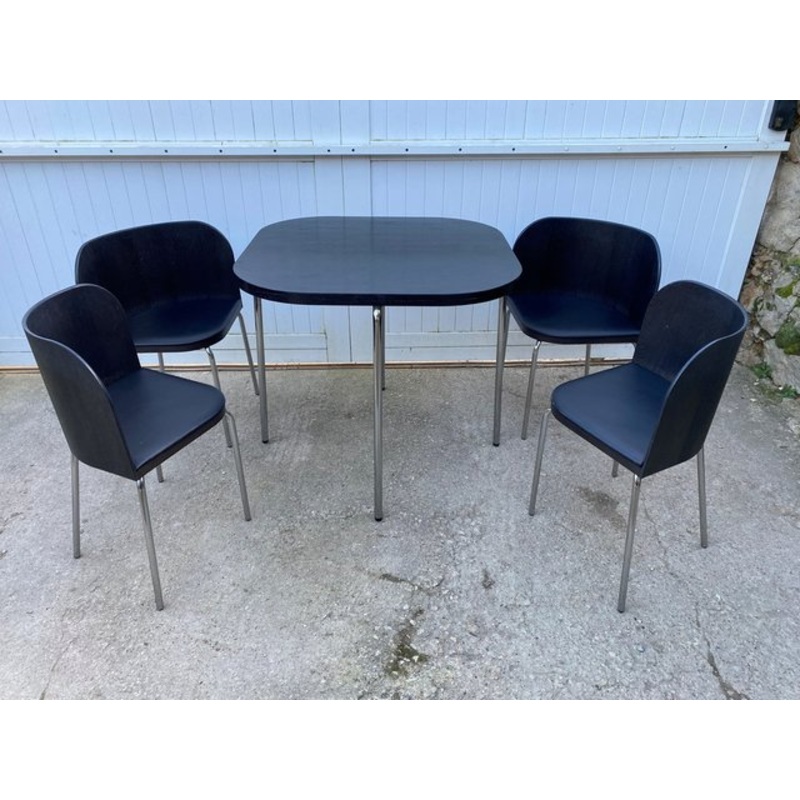 In good general condition, some traces of use,Some small dents on the surface of the table as well as some paint imperfections, chrome in very good condition,Some slight wear on the edge of the skai seatsEnds of the table legs adjustable by screwing,Very b
