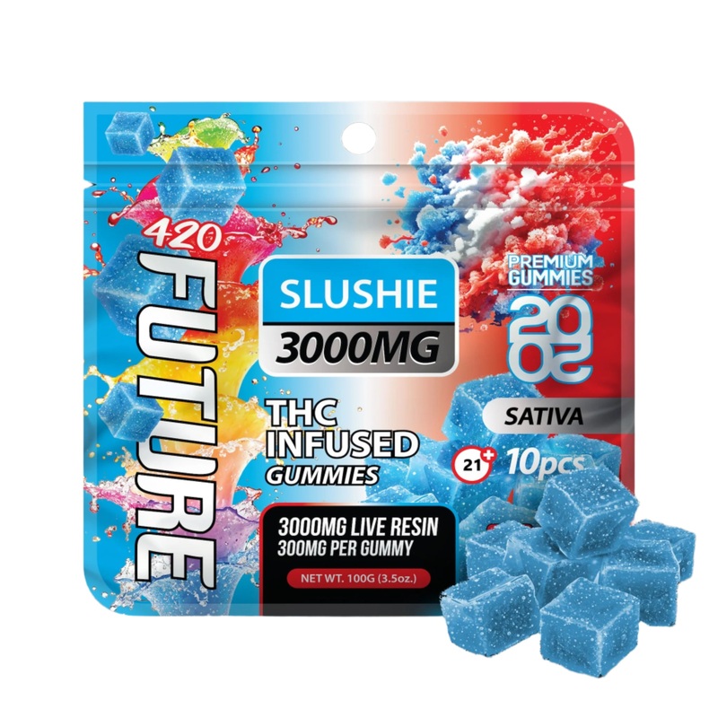 Future THC-A Infused Vegan Slushie Gummies Potent THC-A 10 gummies per bag Slushie flavor 300mg per gummy Resealable bag Sativa Description Indulge in a flavorful experience with Future THC-A Infused Slushie Gummies! Each resealable bag contains 10 sativa