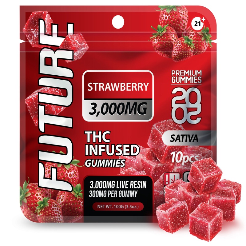 Future THC-A Infused Vegan Strawberry Gummies Potent THC-A 10 gummies per bag Strawberry flavor 300mg per gummy Resealable bag Sativa Description Indulge in a delightful treat with Future THC-A Infused Vegan Strawberry Gummies! With 300mg of potent THC-A p
