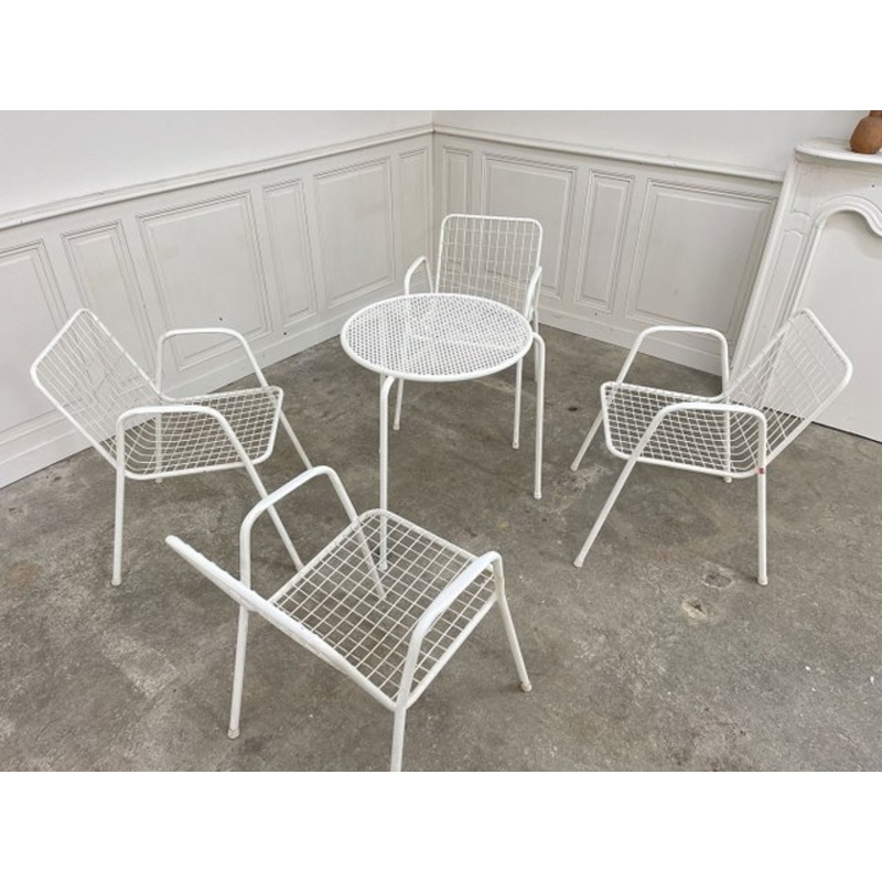 Pretty little vintage garden set consisting of four white metal chairs and a small tripod table.Everything comes from the Italian house EMU and dates from the 1970s. An original label is visible (see our photos)!The armchairs, the iconic Rio model, have si