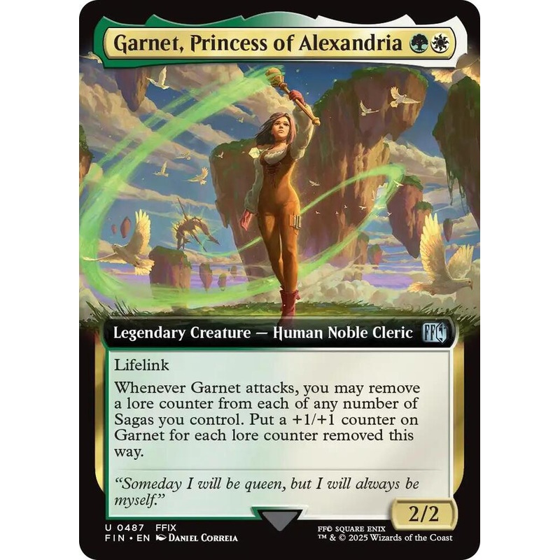 LifelinkWhenever Garnet attacks, you may remove a lore counter from each of any number of Sagas you control. Put a +1/+1 counter on Garnet for each lore counter removed this way.Rarity:U#:487Card Type:Legendary Creature Human Noble ClericP / T:2 / 2Flavor:
