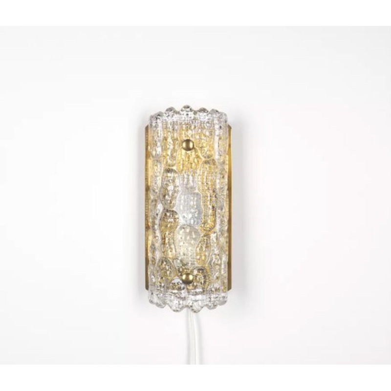 Wall lamp manufactured by Orrefors for Lyfa Sweden in the 1960s.Designed by Carl Fagerlund, Model Gefion.The lamp has a brass frame with a heavy pressed glass shade.The glass has an ice relief so that the light fans through it beautifully.Dimensions W12.5